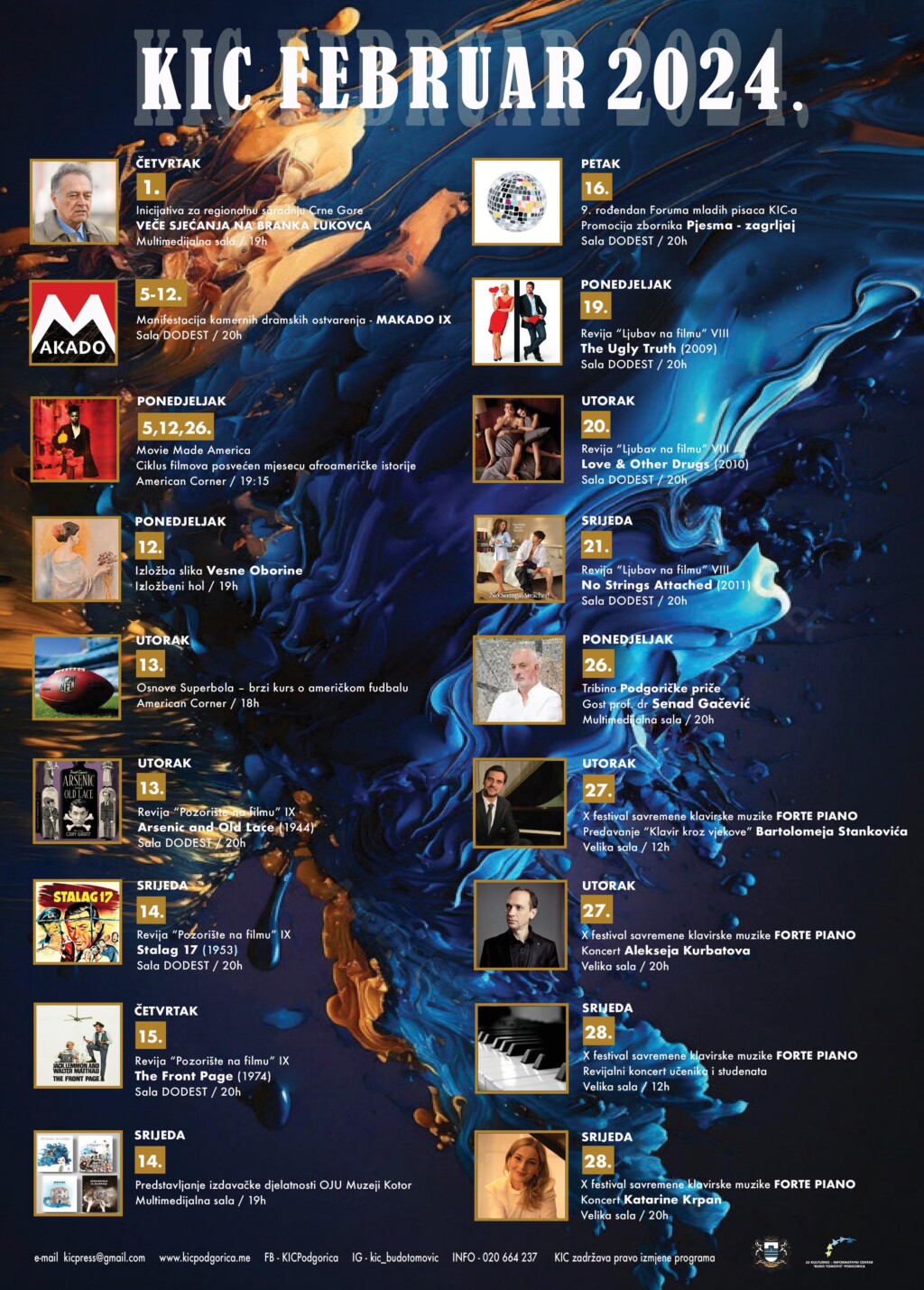 Muzički program KIC-a biće u znaku desetog jubilarnog Festivala savremene klavirske muzike “Forte piano” koji će biti održan 27. i 28.februara. U okviru večernjeg programa festivala nastupiće renomirani koncertni pijanisti i univerzitetski profesori Aleksej Kurbatov i Katarina Krpan, a matine programe obilježiće predavanje prof. Bartolomeja Stankovića na temu “Klavir kroz vjekove“ i revijalni koncert mladih pijanista.