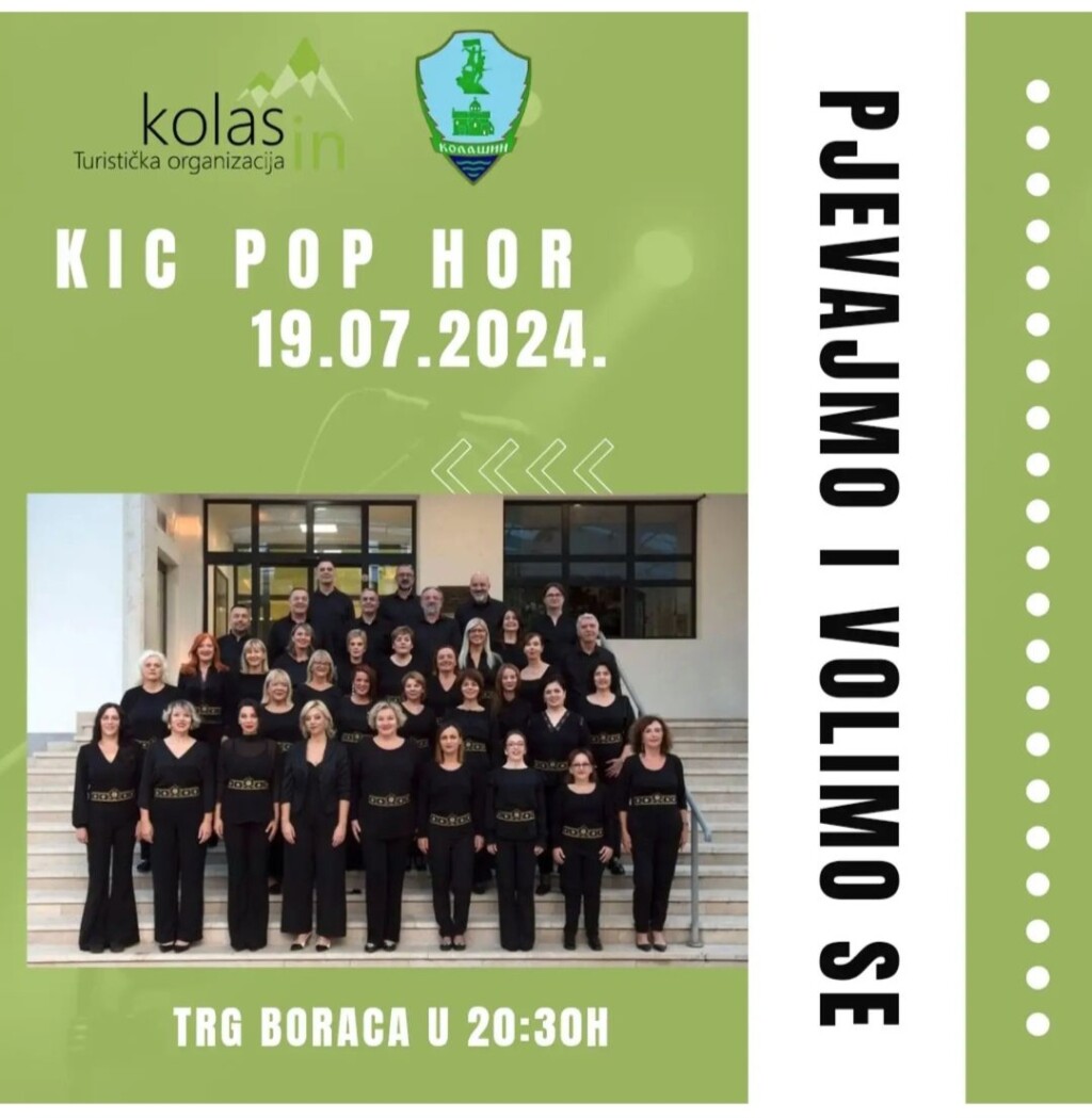 Turistička organizacija Kolašina organizuje koncert popularnog podgoričkog KIC pop hora, pod nazivom „Pjevajmo i volimo se“, u petak, 19. jula 2024. sa početkom u 20.30h na Trgu bor(a)ca.