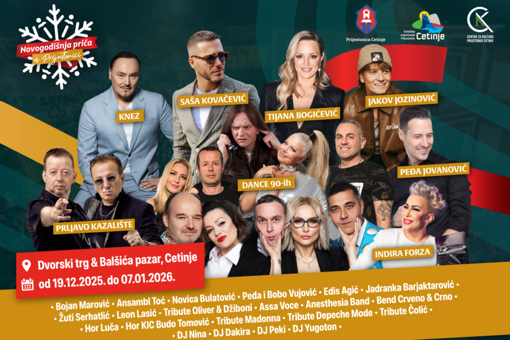 Prijestonica Cetinje, Turistička organizacija Prijestonice i Centar za kulturu i ove godine organizuju prazničnu manifestaciju “Novogodišnja priča u Prijestonici”, koja će trajati od 19. decembra 2025. do 7. januara 2026. godine na Dvorskom trgu i Balšića pazaru, saopšteno je iz gradske uprave.