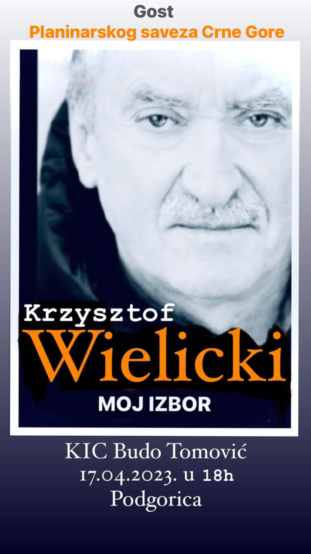 Predavanje slavnog poljskog alpiniste Kristofa Vilickog pod nazivom “Moj izbor“ biće održano u organizaciji Planinarskog saveza Crne Gore u ponedjeljak, 17.aprila, u Multimedijalnoj sali KIC-a “Budo Tomović“ u 18 sati.