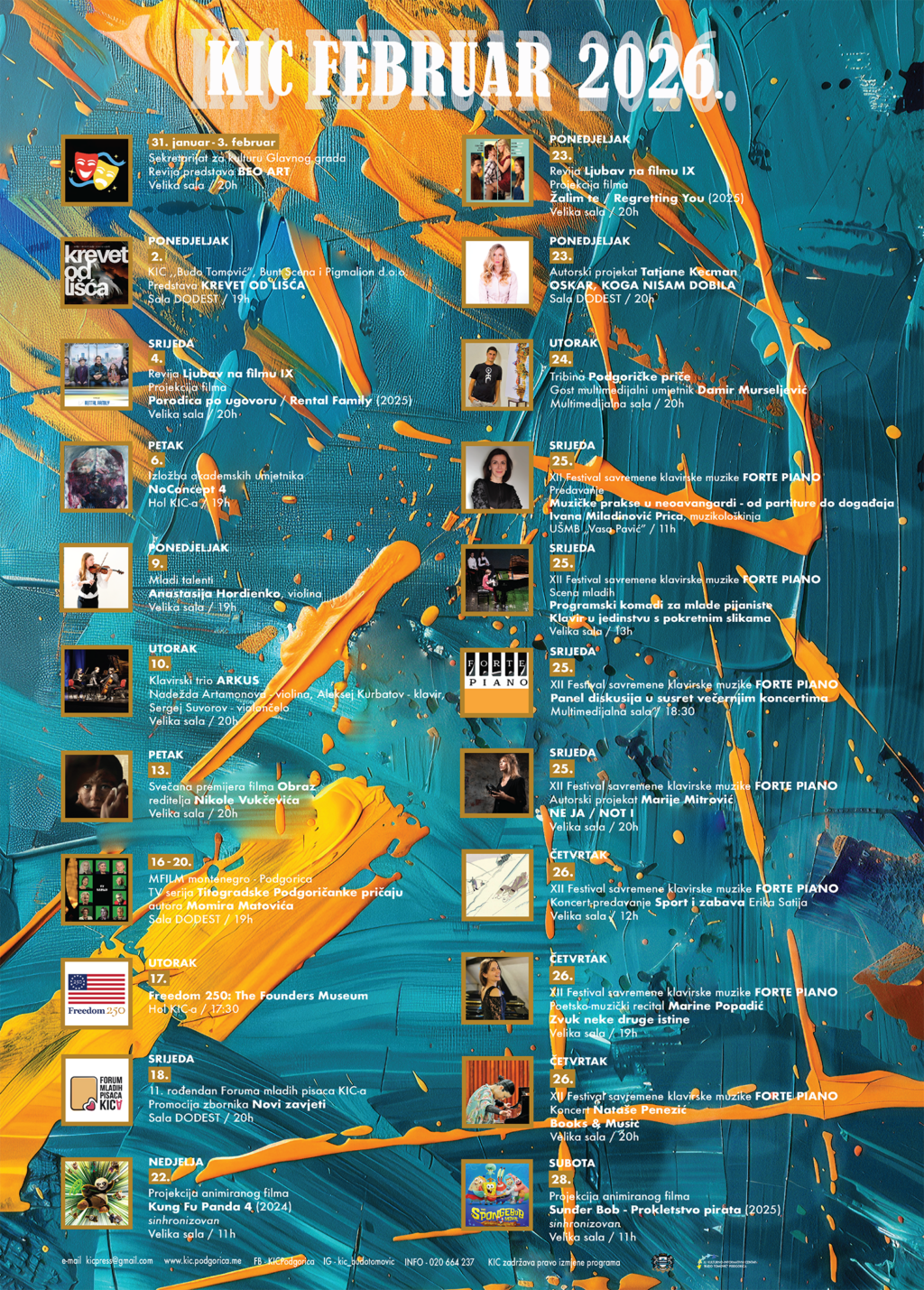 Filmski program biće u znaku svečane premijere filma „Obraz” reditelja Nikole Vukčevića, koji će nakon uspješnog festivalskog života obilježenog sa više od 25 međunarodnih selekcija, dvadesetak osvojenih nagrada, te nacionalne kandidature za nagradu Oskar, 13. februara biti prikazan u digitalizovanoj bioskopskoj sali KIC-a. Deveta u nizu revija „Ljubav na filmu” donijeće filmska ostvarenja koja na različite načine propituju složenost međuljudskih odnosa, a među njima su „Porodica po ugovoru/Rental Family” (2025) i „Žalim te/Regretting You” (2025). Na repertoaru će biti i sinhronizovani animirani filmovi „Kung Fu Panda 4”(2024) i „Sunđer Bob – Prokletstvo pirata” (2025). Publika će biti u prilici od 16. do 20. februara da pogleda i televizijski serijal „Titogradske Podgoričanke pričaju” autora Momira Matovića.