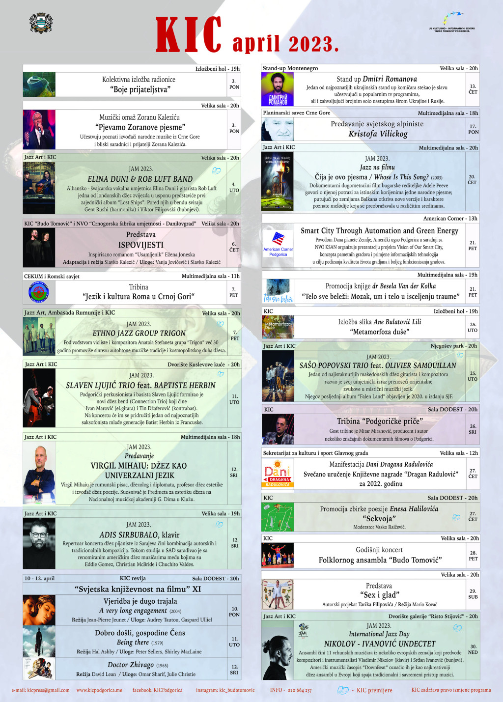 April mjesec u KIC-u i ove godine obilježiće manifestacija “Mjesec poštovanja džeza u Crnoj Gori – JAM 2023” koja se održava pod motom “Balkan France Jazz Connections”. Šesnaesto izdanje manifestacije svečano će početi 4.aprila koncertom albansko – švajcarske vokalne umjetnice Eline Duni i gitariste Roba Lufta, jedne od londonskih džez zvijezda u usponu. Na repertoaru koncertnog dijela manifestacije biće i nastup etno džez grupe “Trigon” koja već 30 godina promoviše sintezu autohtone muzičke tradicije i kosmopolitskog duha džeza, ali i koncert trija podgoričkog perkusioniste i basiste Slavena Ljujića kojem će se na koncertu pridružiti jedan od najpoznatijih saksofonista mlađe generacije Batist Herbin iz Francuske. Džez pijanista iz Sarajeva Adis Sirbubalo izvodiće autorske i tradicionalne kompozicije 12.aprila, a jedan od najistaknutijih makedonskih džez gitarista i kompozitora Sašo Popovskisa svojim trijomnastupiće 25.aprila. Završnicu manifestacije obilježiće gostovanje ansambla od 11 vrhunskih muzičara iz nekoliko evropskih zemalja koji predvode kompozitori i instrumentalisti Vladimir Nikolov (klavir) i Srđan Ivanović (bunjevi).