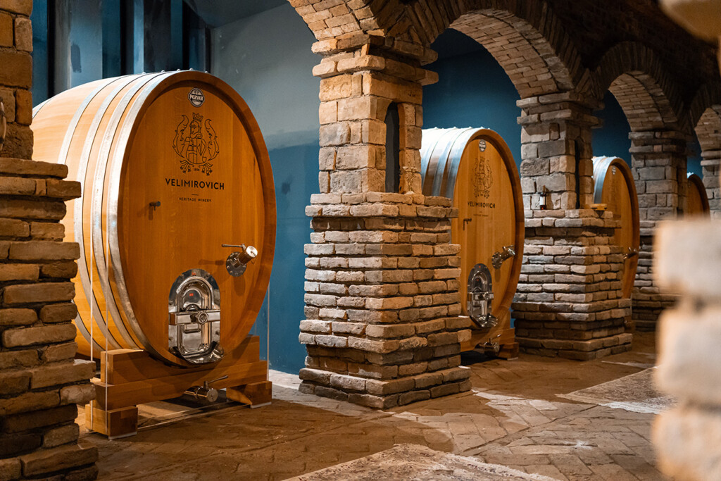 Vina vinarije Velimirovich upijaju najizrazitije karakteristike svog prostora, modernog arhitektonskog izraza, nastalog savremenom interpretacijom izvorne građevinske umješnosti žitelja ovog dijela Katunske nahije. Podrumi su podrumi u punom značenju riječi: smješteni su ispod površine tla, sa fasadama isklesanim od monolitnih kamenih stijena vađenih sa samog imanja tokom sadnje vinograda. Čine ih dvije odvojene cjeline. Prva služi za preradu grožđa i proizvodnju vina, koje odležava u inoks buradima, prolazeći kroz proces fermantacije. U drugom dijelu podruma, vino odležava u barik buradima i bačvama, flašira se i skladišti.
